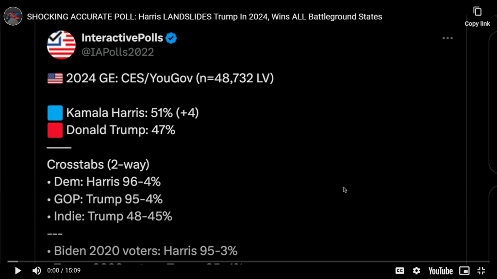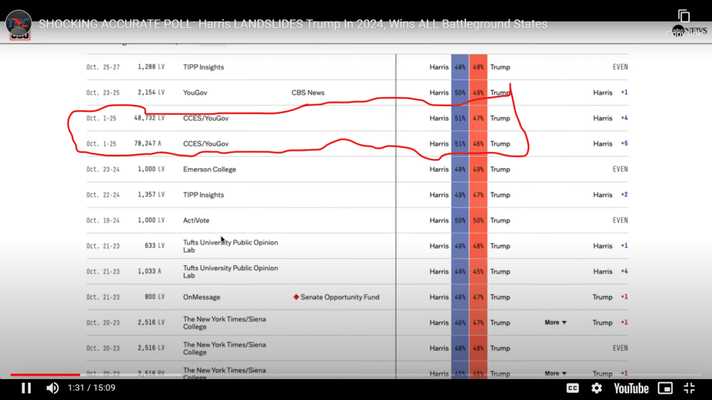 This recent CES/YouGov poll interviewed almost 50,000 people suggesting a 4-point lead for Harris, ( Note most polls interview as few as 350 people but not more than 2500.)
