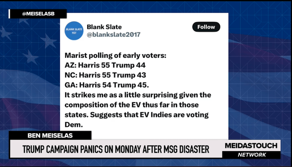 I follow sources that rely on real data to help audiences understand where we stand in the election cycle. I will share data that has been collected from early voting exit polls. These represent voters who shared their choices for the Presidency.