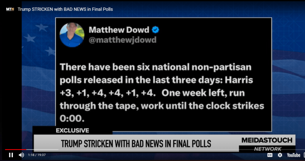 Finally, the Harris/Walz campaign inherited a massive ground infrastructure from Joe Biden. They are geared up to turn out the vote through election day. Watch for the vote totals reported for Florida, North Carolina, and Georgia. Either could hold a surprise as they are regarded as Republican-safe or leaning states. However, they have fallen into play in recent weeks.